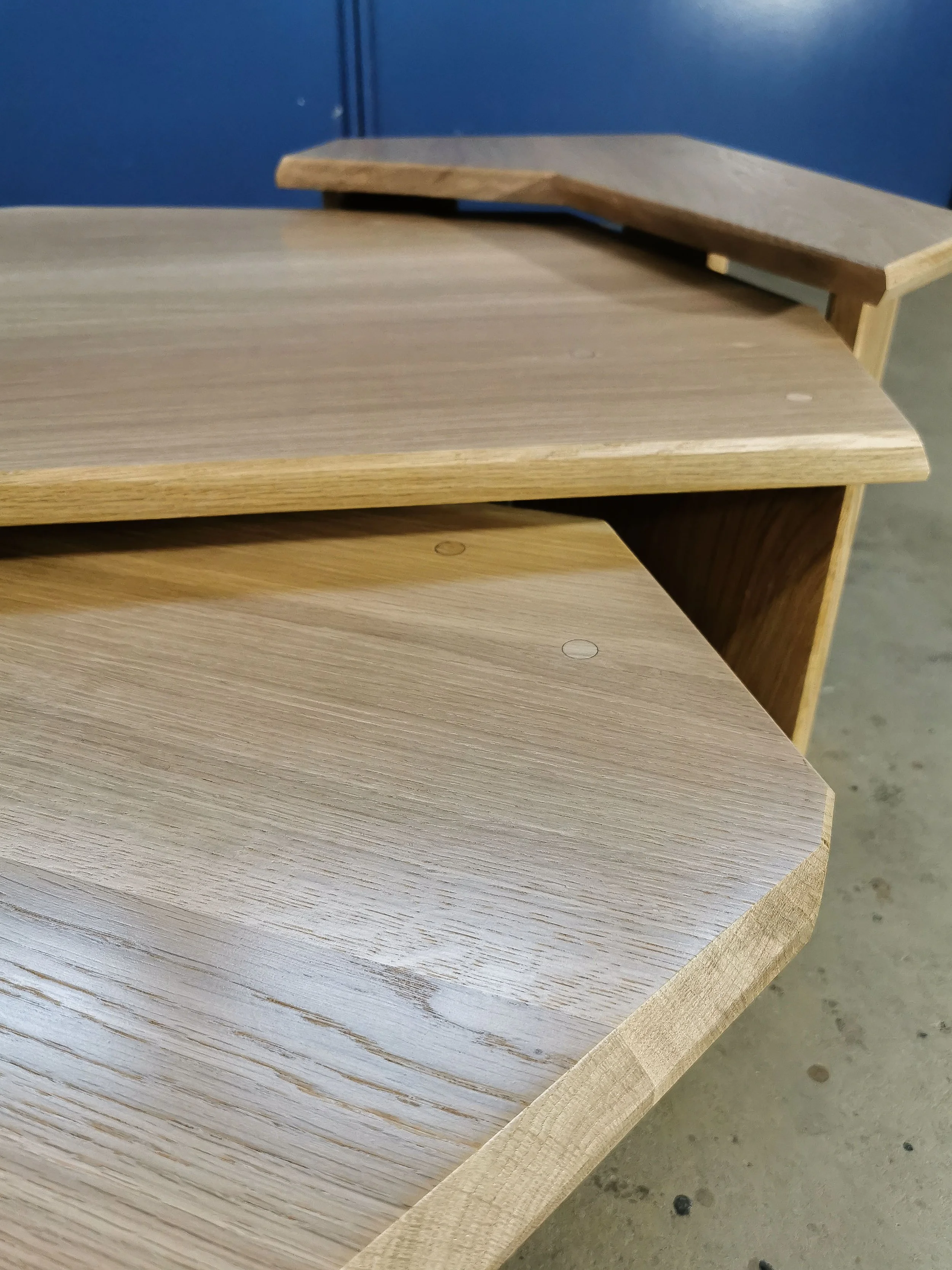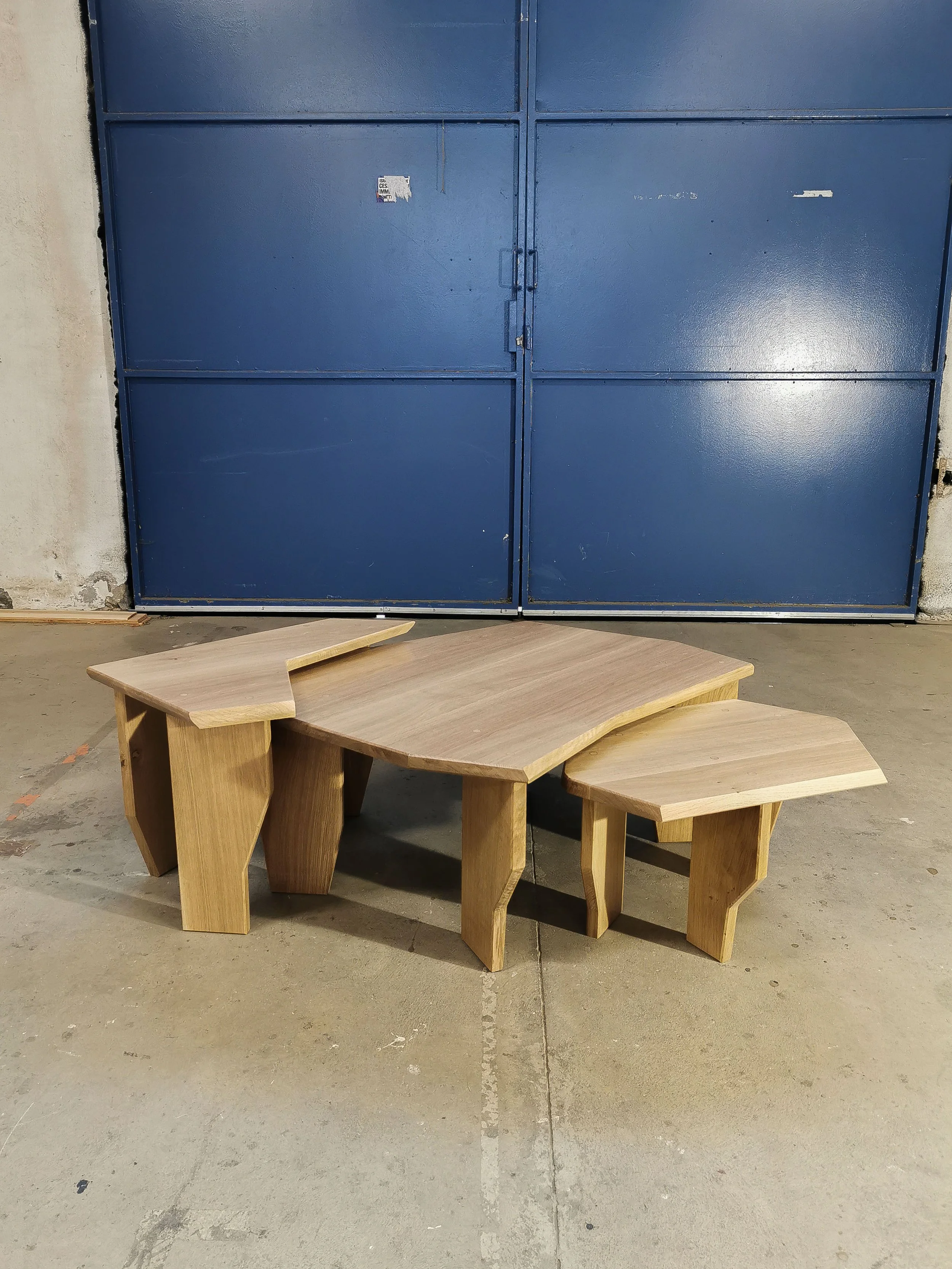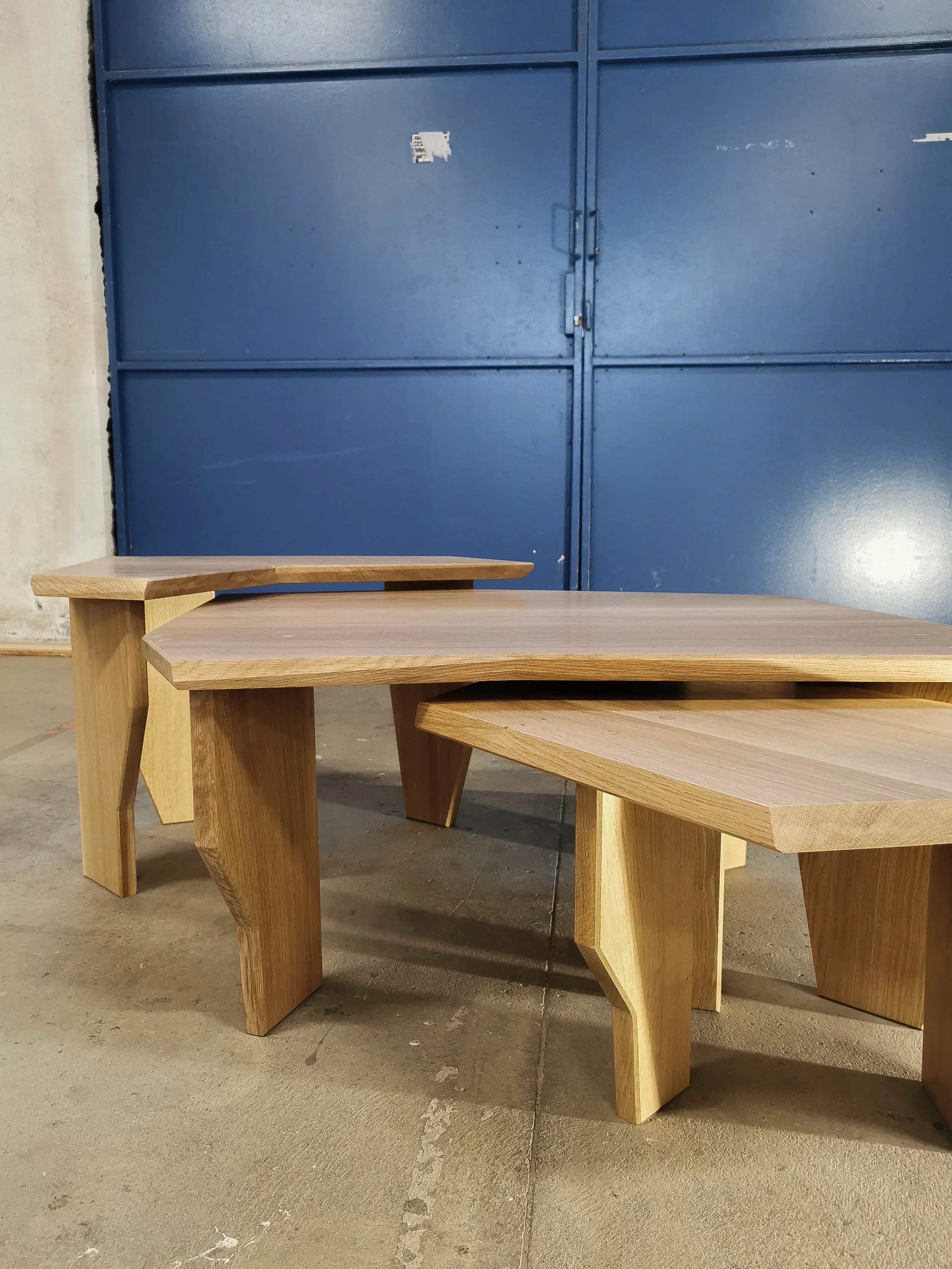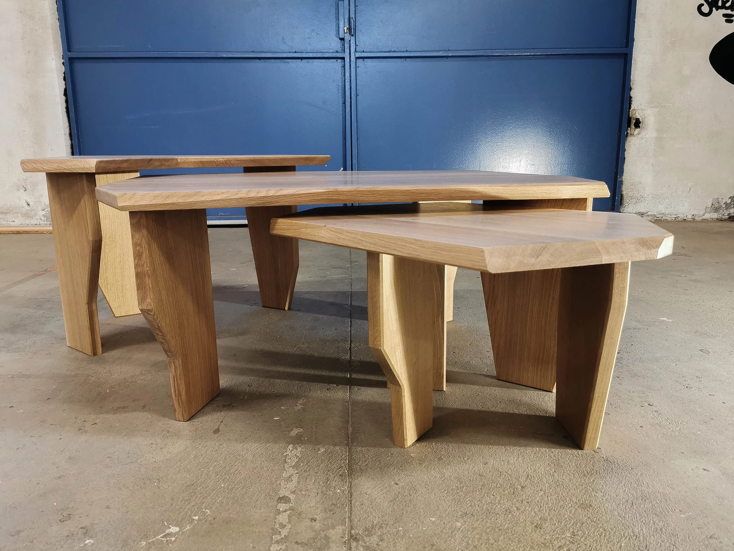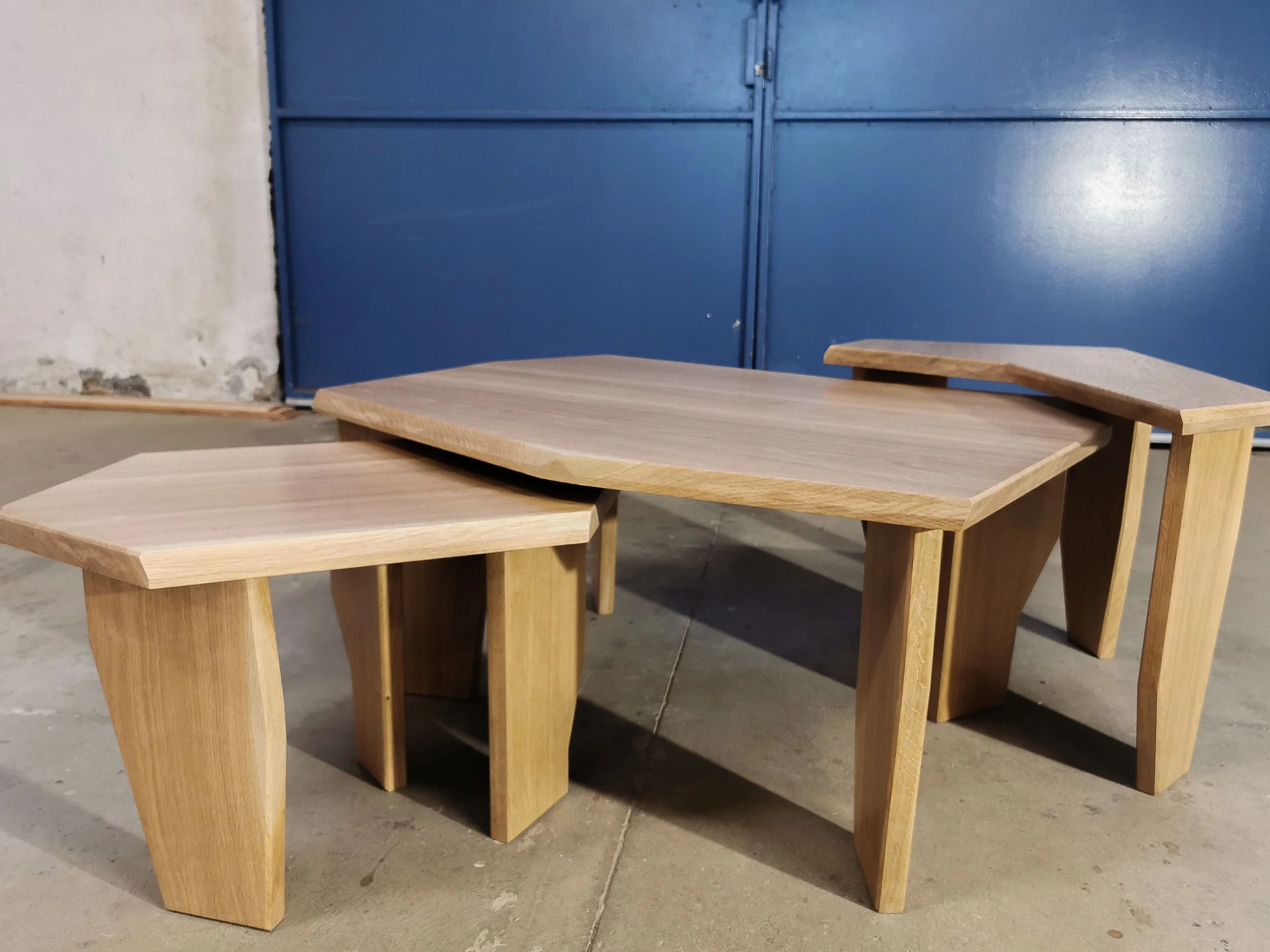 Création & fabrication d’une table basse façon gigogne pour un salon nantais. La table se déploie au grès des besoins avec ses 3 modules se superposant.